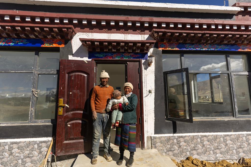 2025年10月24日,在西藏定日县长所乡杂村,外公米玛(左)、母亲朋琼和次仁拉巴在已交付的新房前合影。新华社记者 姜帆 摄