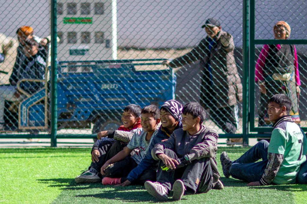 2026年1月5日,在森嘎村的足球场上,少年在观看伙伴们踢球。新华社记者 姜帆 摄