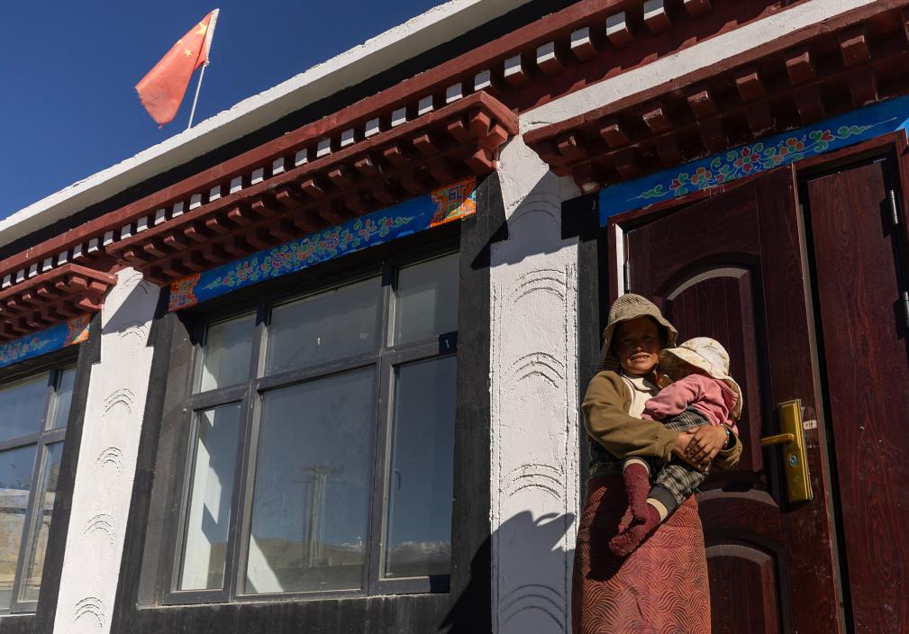 次仁拉姆在刚交付的新居前怀抱女儿格桑巴宗(2025年10月24日摄)。新华社记者 姜帆 摄