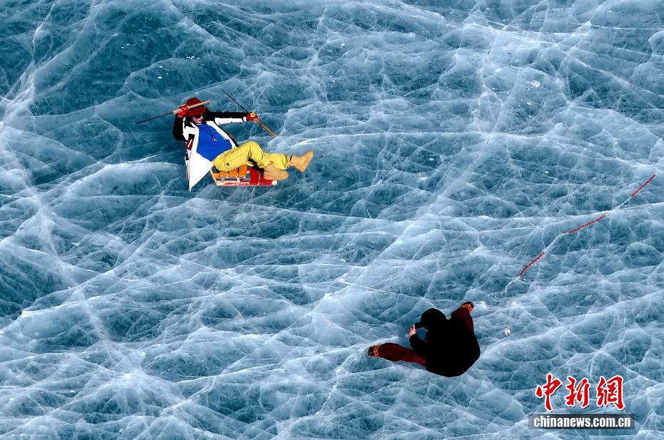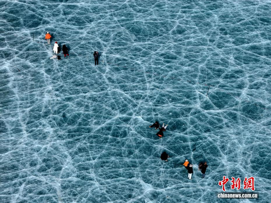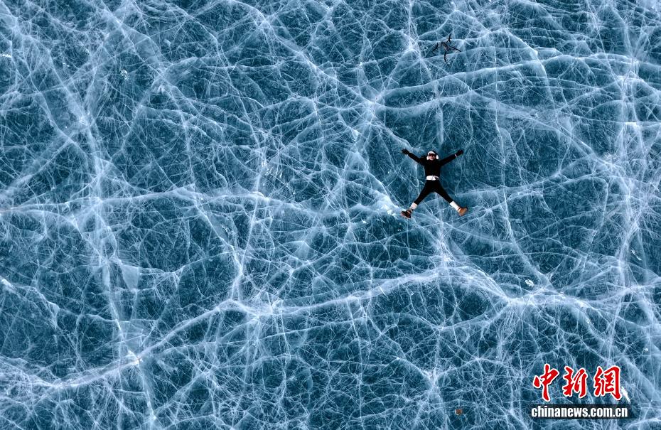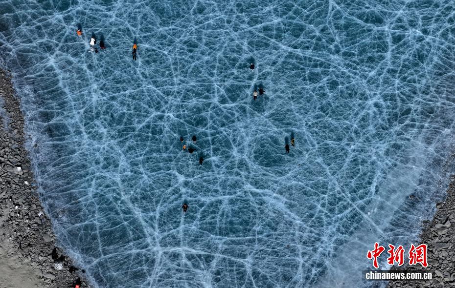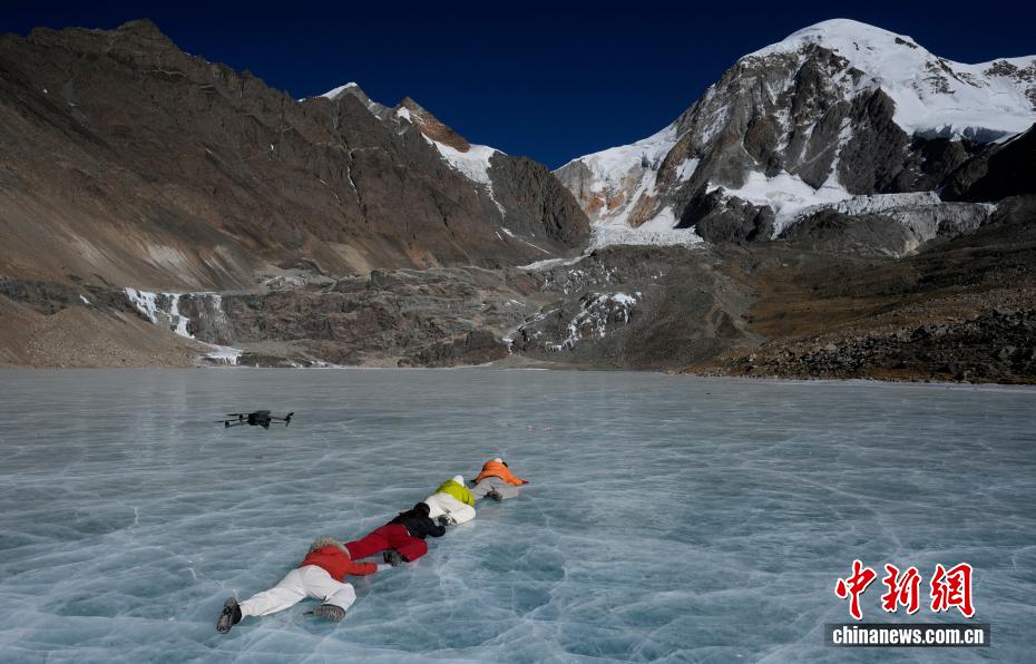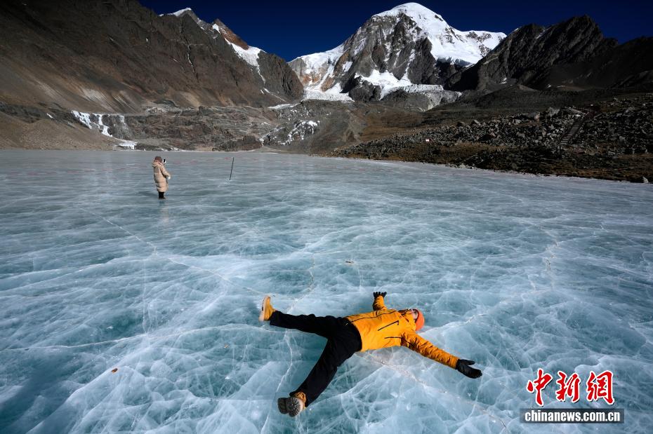 1月16日,游客在琼穆岗嘎雪山脚下的冰湖拍照。矗立于西藏拉萨市尼木县麻江乡的琼穆岗嘎雪山,海拔7048米。受冬季寒冷天气影响,琼穆岗嘎雪山脚下的湖泊结冰,雪山冰湖交相辉映,吸引游客前来游玩、观赏。中新社记者 李林 摄