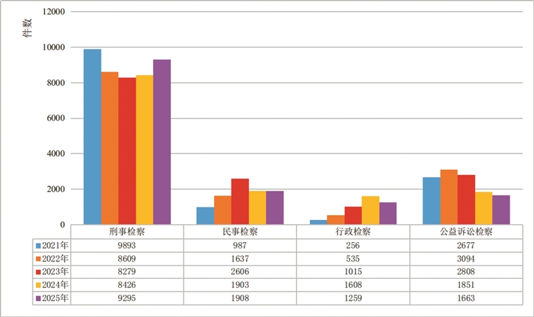 2021年—2025年全区检察机关“四大检察”业务趋势变化图