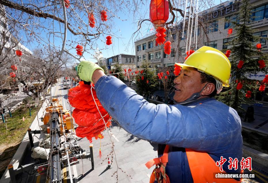 2月3日,西藏拉萨,工人沙吉顿珠正在挂灯笼。随着春节、藏历新年的临近,拉萨城区大街小巷被精心装点,年味愈发浓郁。中新社记者 李林 摄