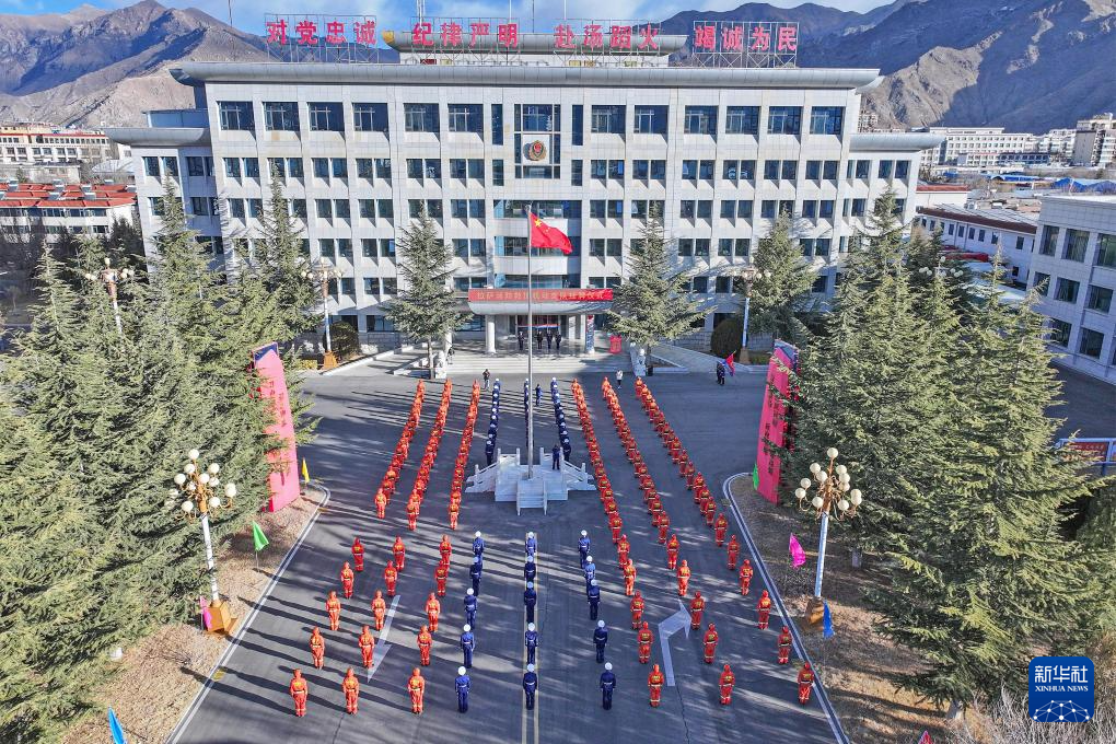 2月5日拍摄的拉萨消防救援机动支队挂牌仪式现场(无人机照片)。新华社发(郑龙 摄)