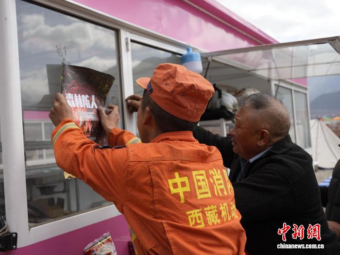 图为给商铺宣传防火知识。丹增平措 摄