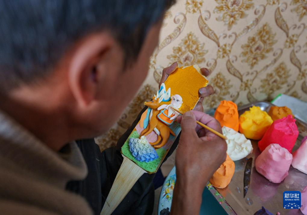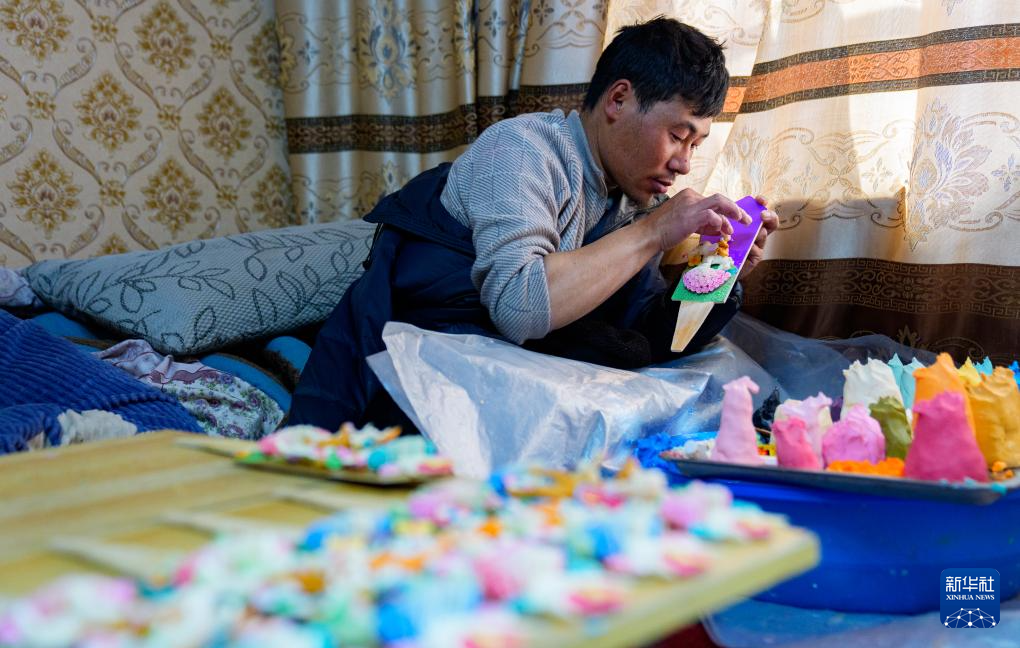 2月12日,在拉萨市林廓东路,来自西藏日喀则市仁布县普松乡的手工艺人罗布在制作酥油花。新华社记者 丁增尼达 摄