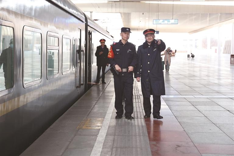 列车出发前,左红彬(左)在站台进行安全检查。通讯员 黄飞 摄