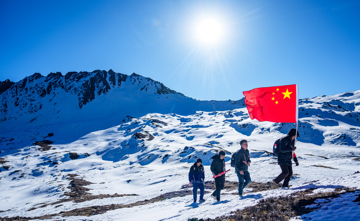 50岁的普布罗布单手举着五星红旗,走在队伍最前面。索朗多吉不时用望远镜看向更远处的雪线。“有没有人越过边境,裸露的石头上有没有他国的标识物……这些都是巡边要注意的事。”他说。