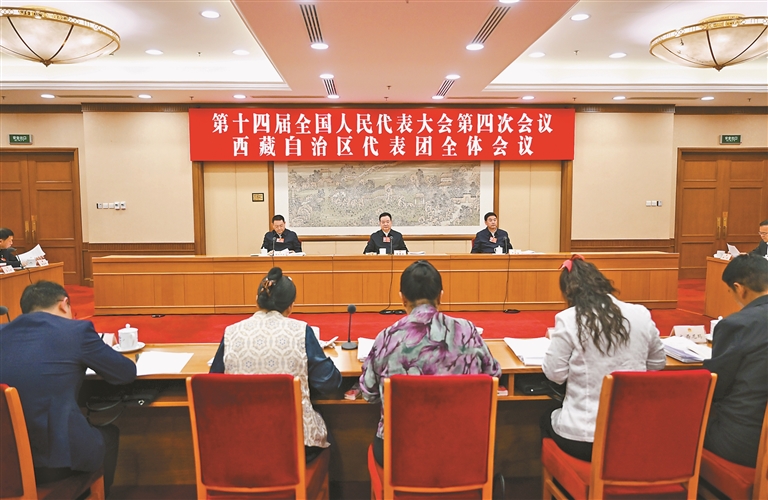 西藏代表团团长、自治区党委书记王君正,西藏代表团副团长、自治区党委副书记、自治区人大常委会主任严金海参加。西藏代表团副团长、自治区党委副书记、自治区主席嘎玛泽登主持。