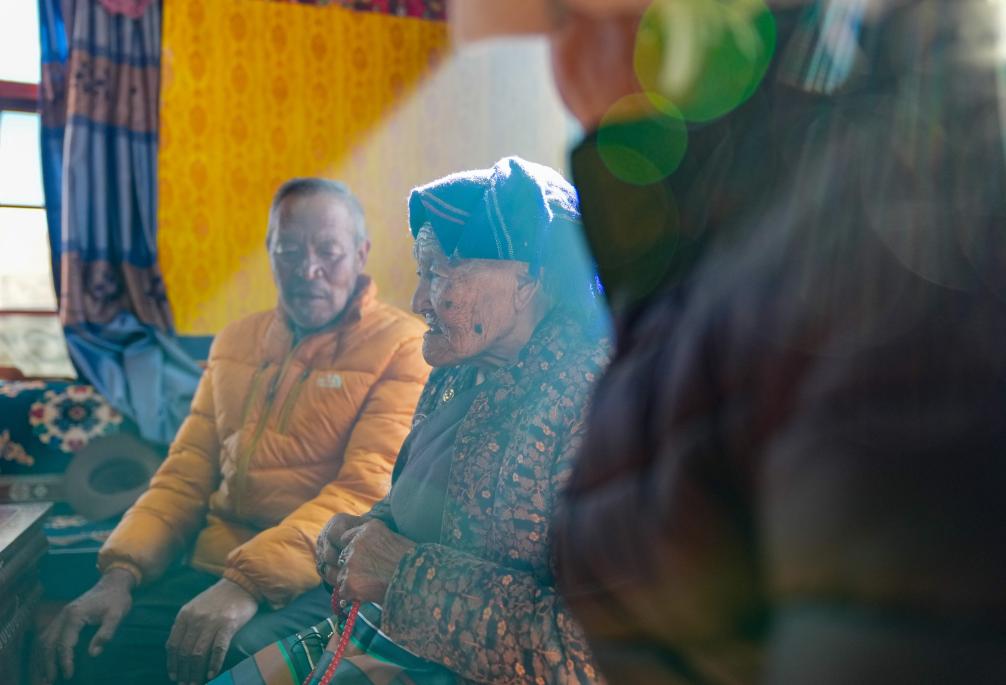 贡觉曲珍(中)和家人在家中聊天(3月6日摄)。