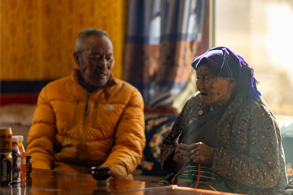 贡觉曲珍(右)在家中和儿子聊天(3月6日摄)。