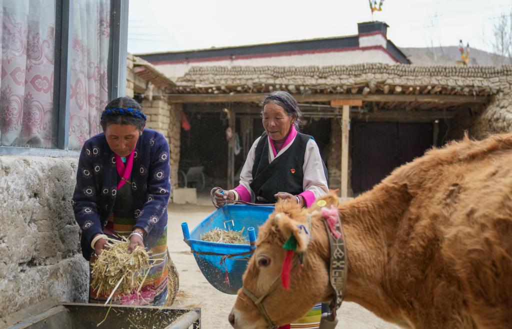 普珍(右)和儿媳在喂牛(3月12日摄)。