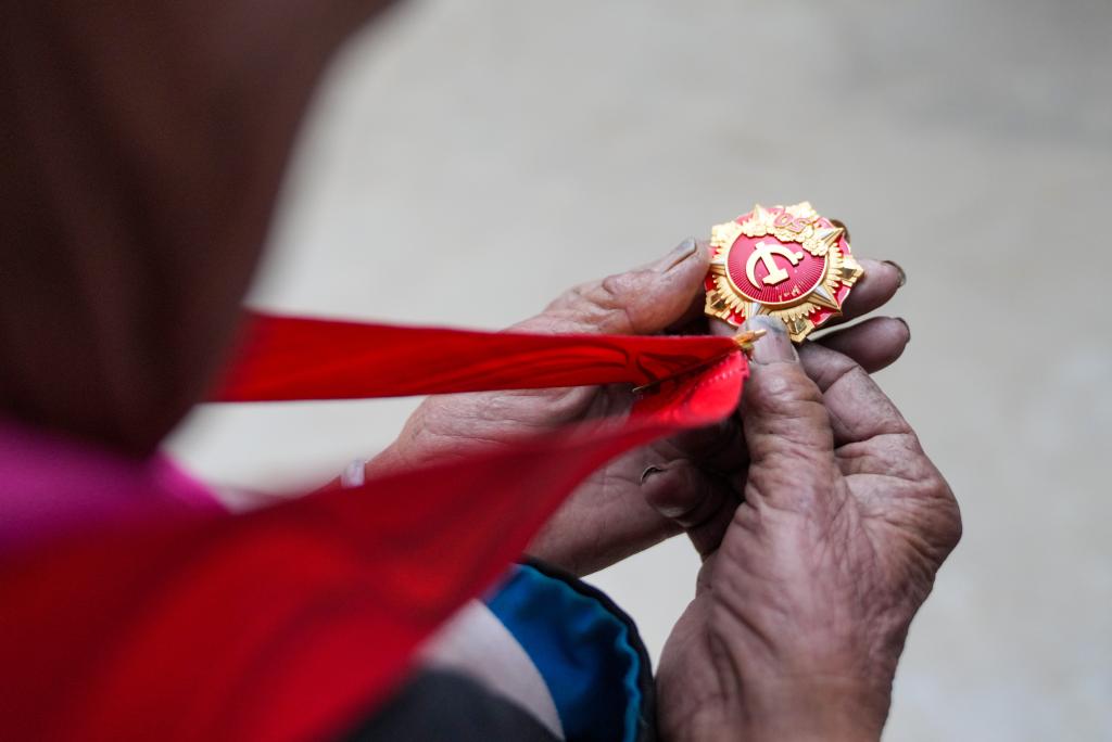普珍佩戴上“光荣在党50年”纪念章(3月12日摄)。