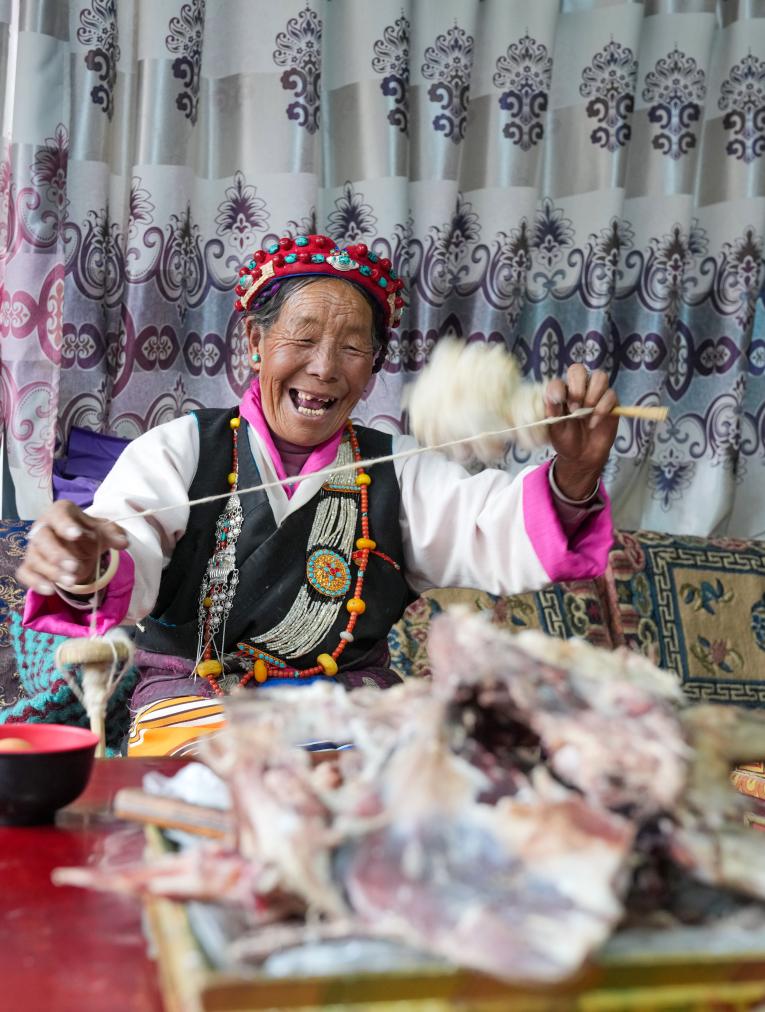 普珍在家纺羊毛线(3月12日摄)。