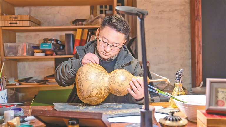 就像做掐丝葫芦,他会先有线稿,但最终会根据葫芦本身的形状与色泽,让唐卡图案与掐丝纹样在制作中相互调整、逐步呈现。“就像草原上的河,它有它的流向,你只需顺着它的流势,稍加引导就好。”这种“因材施艺、顺势而为”的创作态度,让他的作品既有手作的温度,又透着一股生动的自由。