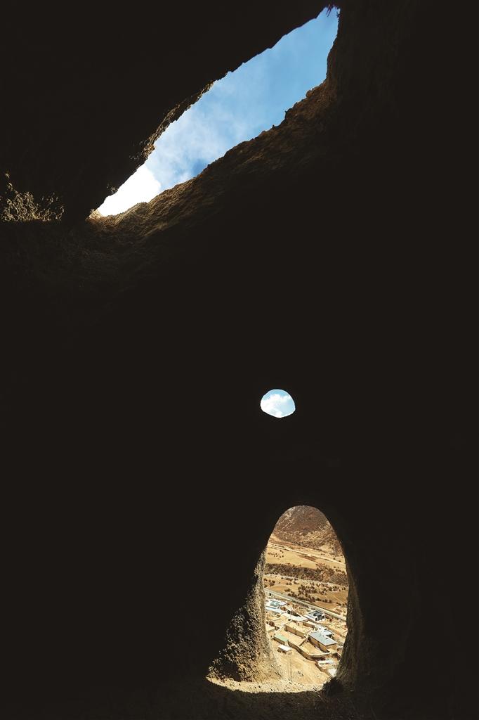 恰日多山洞位于拉萨市墨竹工卡县门巴乡仁多岗村恰日多自然组北约50米处的囊扎日山半山腰,洞口坐西朝东、门向正东。洞口呈阶梯状层次,步入洞内向外眺望,三孔景致错落有致:最上方为不规则岩顶开口,澄澈蓝天与流云倾泻而入,明暗对比鲜明;中间是圆形小窗,宛如嵌在岩壁上的“天空之眼”,框住漫天云絮;最下方为拱形门洞,向外望去,河谷间土黄色藏式民居错落排布,与高原草甸、连绵远山相融,尽显藏地乡村的质朴辽阔。