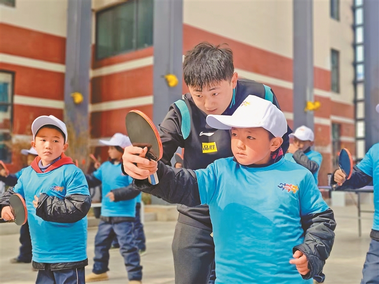 学生在教练员的指导下练习乒乓球挥拍动作。