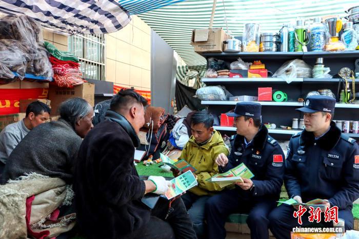 图为里孜边检站民警走进商铺介绍国家安全教育相关法律知识。刘海东 摄