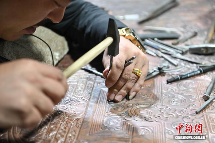 图为西藏雪堆白技工学校金属技艺教师罗布顿珠,正在专注进行金属锻造创作。贡嘎来松 摄