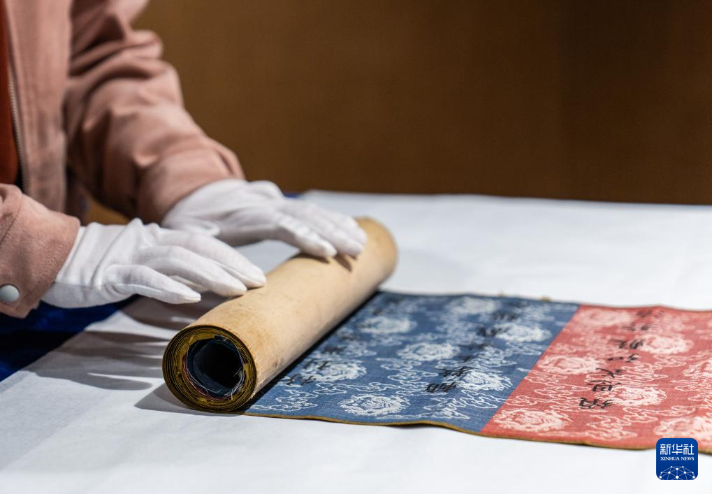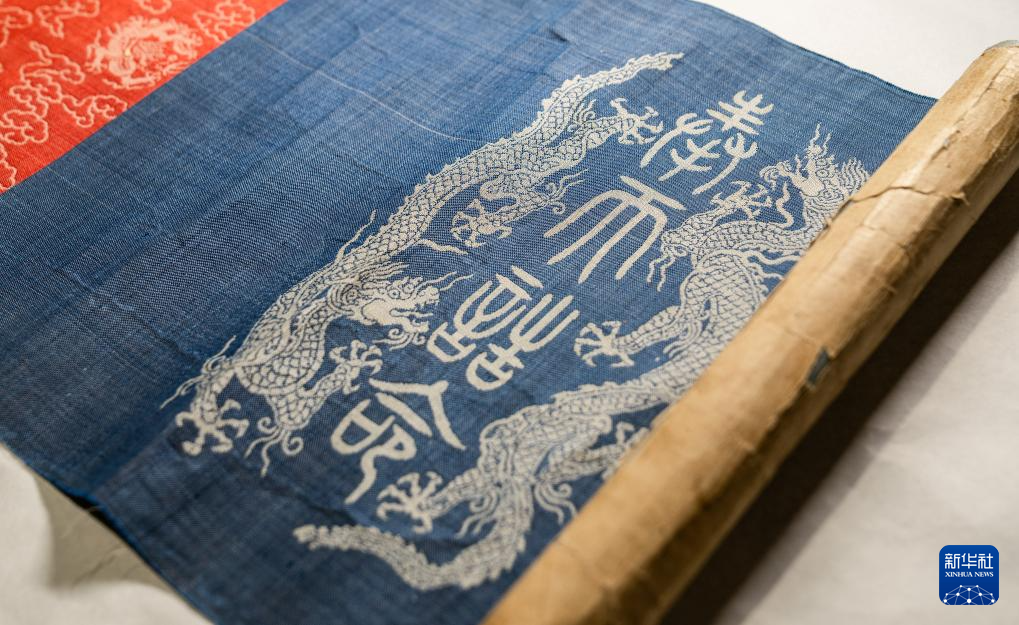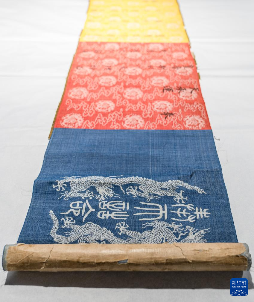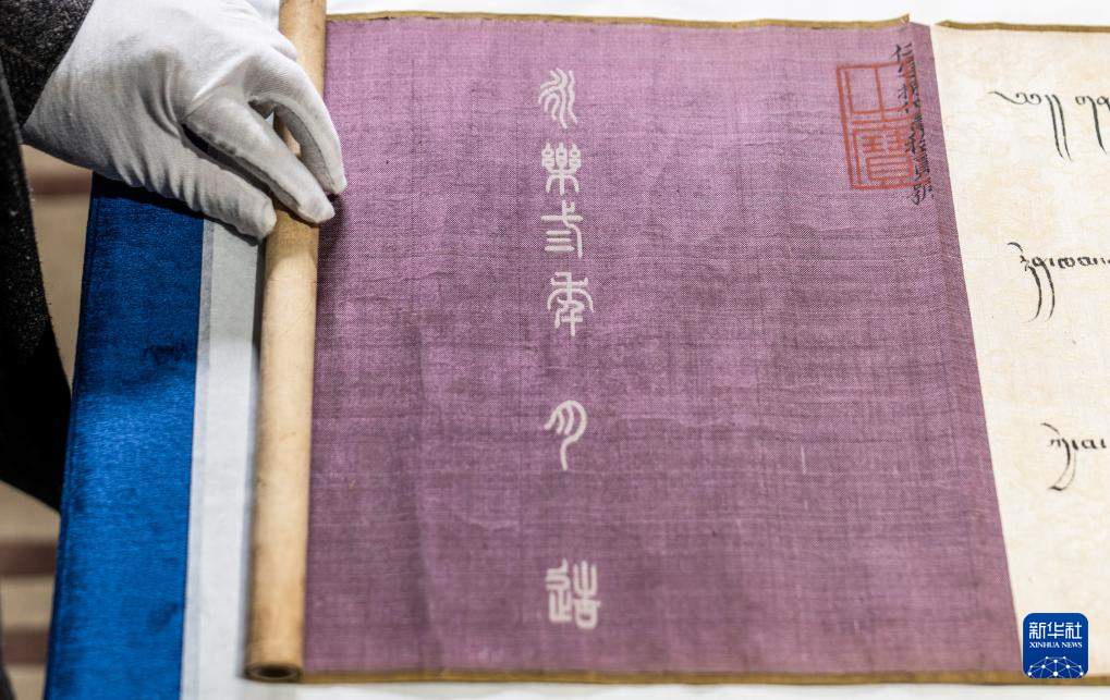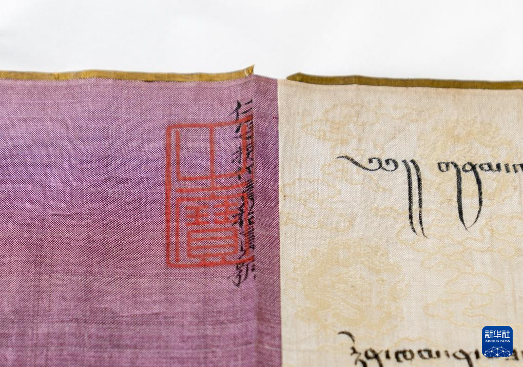 这是《永乐十一年封斡喃渴烈思巴为辅教王诰书》卷首(5月20日摄)。篆书“奉天诰命”四个字和双龙图案均是锦缎织造时应用提花技术以不同色彩的丝线织成。新华社记者 李贺 摄