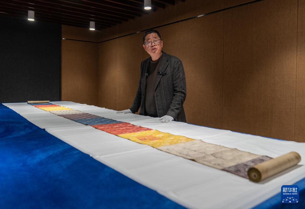 西藏博物馆研究馆员何晓东介绍《永乐十一年封斡喃渴烈思巴为辅教王诰书》(5月20日摄)。新华社记者 李贺 摄