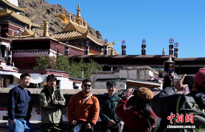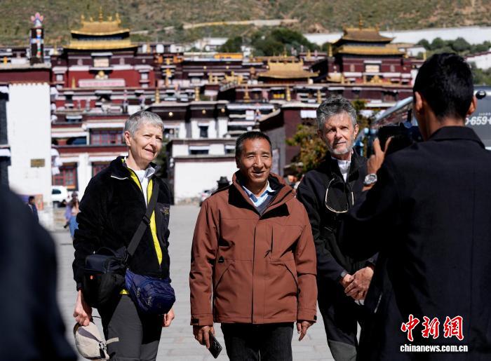 10月7日,外国游客在西藏日喀则市扎什伦布寺与导游合影留念。扎什伦布寺始建于公元1447年,是中国国家5A级旅游景区。凭借深厚的历史底蕴和独特的文化魅力,吸引众多中外游客参观游览。中新社记者 李林 摄