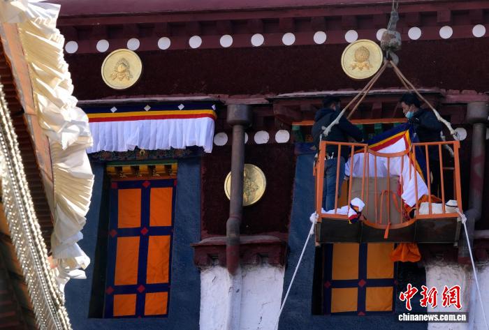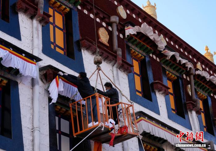2月5日,西藏大昭寺更换“香布”,迎藏历新年。“香布”是藏式建筑的装饰,通常用五彩棉布缝制,主体为白色,搭配红蓝黄等色的边沿,对窗沿等的颜料及木构件起到保护作用。图为工人们正乘坐吊车更换大昭寺“香布”。中新社记者 李林 摄