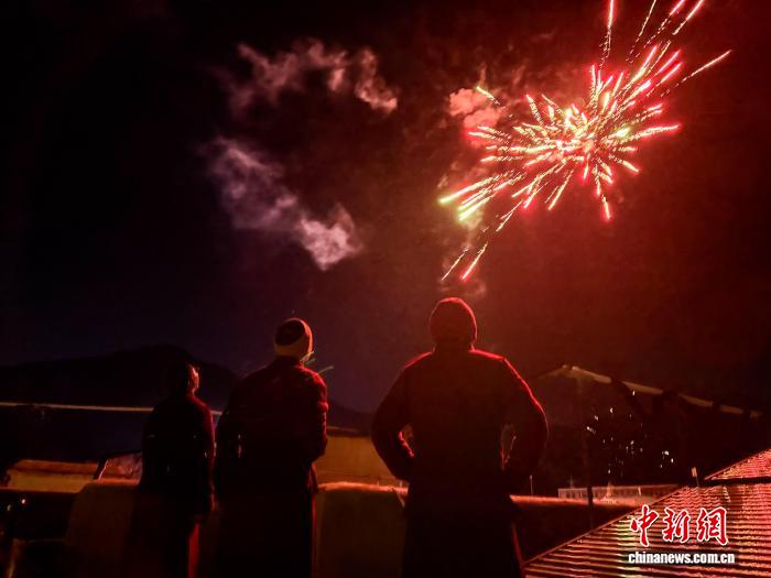 2月16日“古突”夜,桑耶寺僧人在房顶看烟花。中新社记者 赵朗 摄