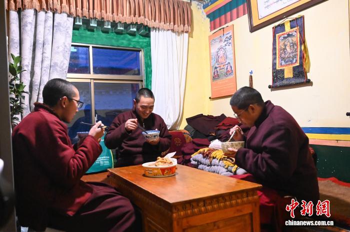 2月16日晚,桑耶寺僧人在“古突”夜吃“古突”,迎接新年到来。中新社记者 赵朗 摄