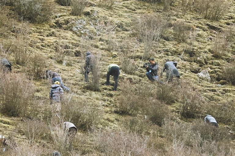 随着游客们纷纷涌上虫草山开始体验挖虫草,其美次仁也和当地的虫草采挖能手们一起为直播间里的观众演示如何挖虫草,讲解虫草采挖的技术和知识,将直播带向高潮。