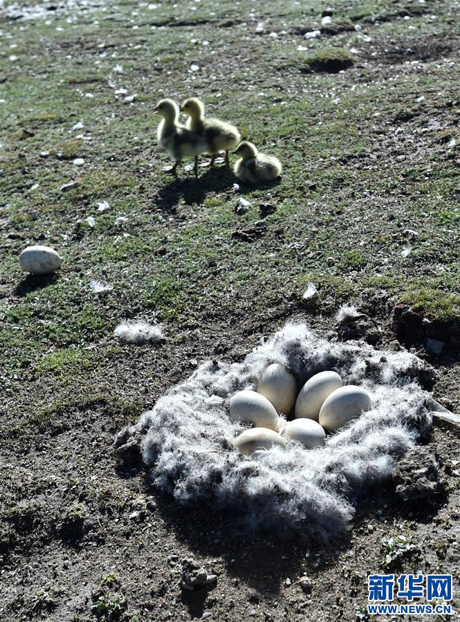 6月9日拍摄的西藏安多县境内嘎龙湖鸟岛上的斑头雁雏鸟及鸟蛋。新华社记者 觉果 摄