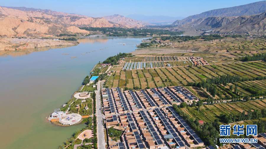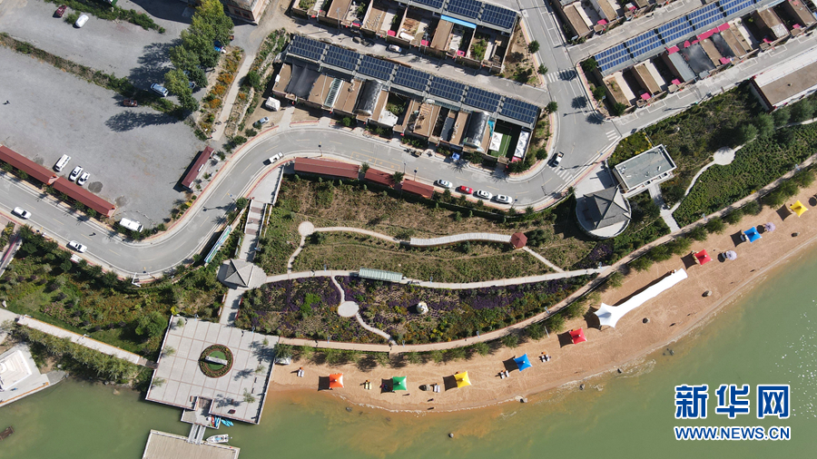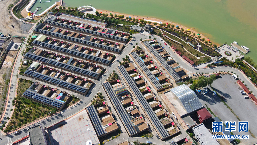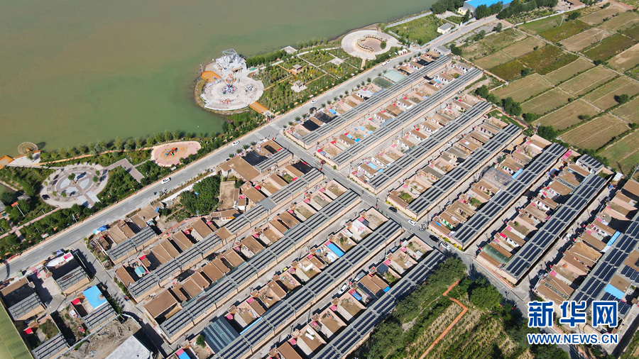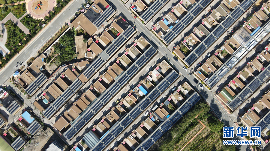 从高处俯瞰,屋顶上一片片光伏发电板排列整齐。新华网 卡娅梅朵摄