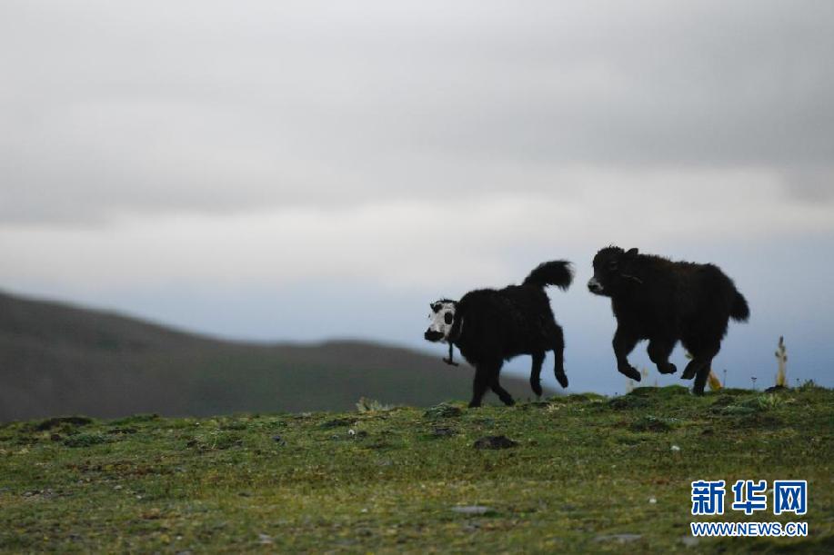8月3日,在玛沁县当洛乡贡龙村的夏季草场上,牧民在拴牦牛。新华社记者 张龙 摄