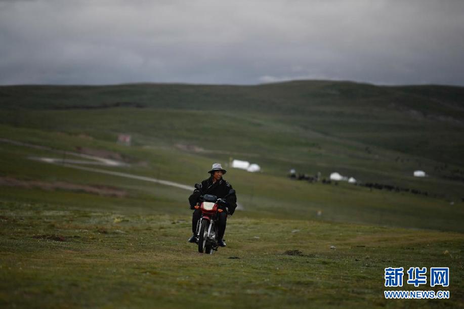 8月3日,在玛沁县当洛乡贡龙村的夏季草场上,牧民骑着摩托车在查看牛羊。新华社记者 张龙 摄