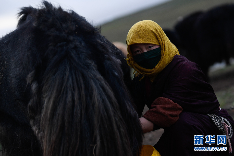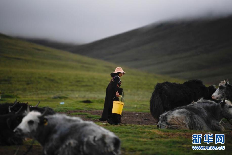 8月3日,在玛沁县当洛乡贡龙村的夏季草场上,牧民准备挤牛奶。新华社记者 张龙 摄