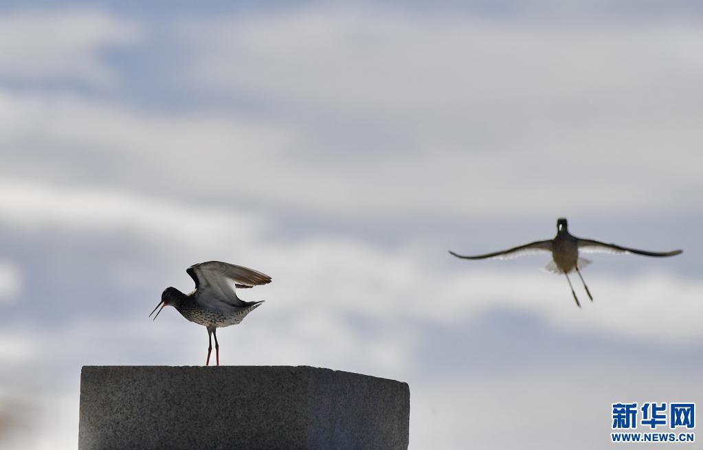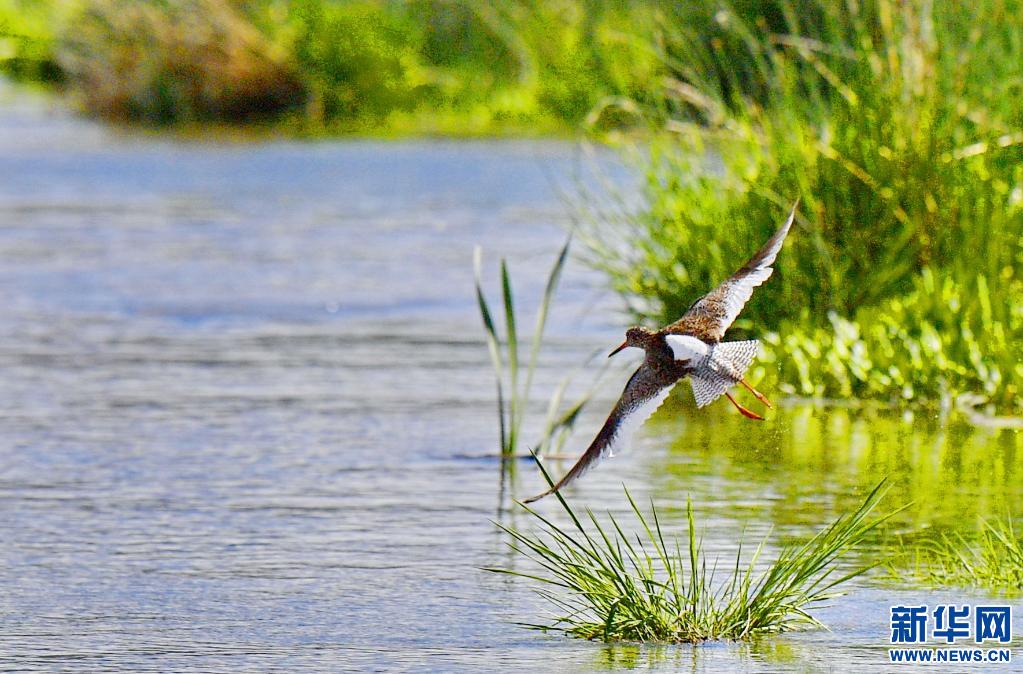 红腿鹬在拉鲁湿地上起舞(6月2日摄)。新华社记者 张汝锋 摄
