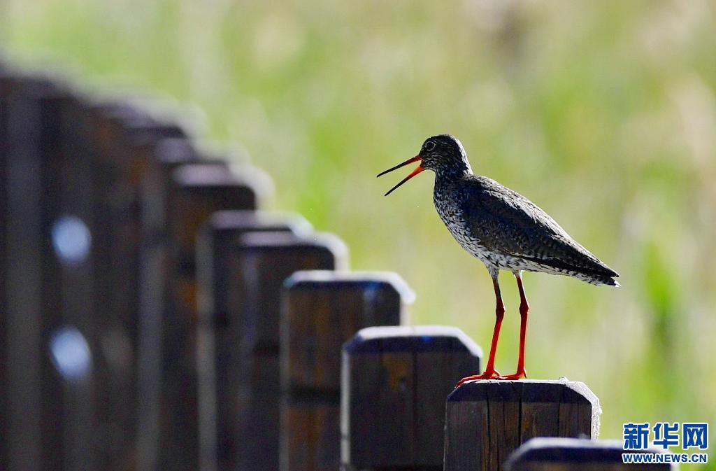 在拉鲁湿地人行步道栏杆上鸣叫的红腿鹬(6月2日摄)。新华社记者 张汝锋 摄