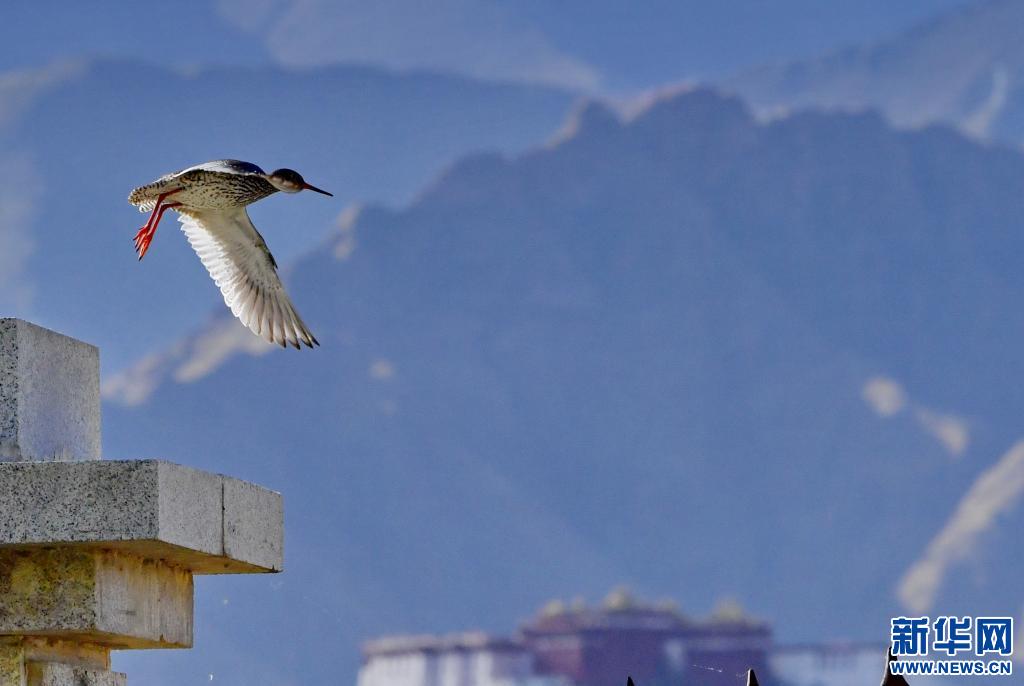 红腿鹬在拉鲁湿地上空飞舞(6月2日摄)。新华社记者 张汝锋 摄