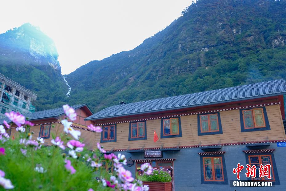 8月,玉麦乡的“格桑花”、民居及远处的飞瀑。江飞波 摄