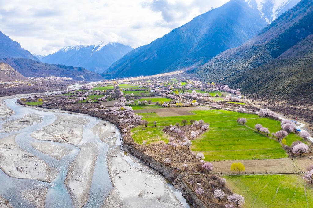 西藏林芝市波密县境内桃花盛开的田园风光(2020年3月26日摄,无人机照片)。新华社记者普布扎西 摄