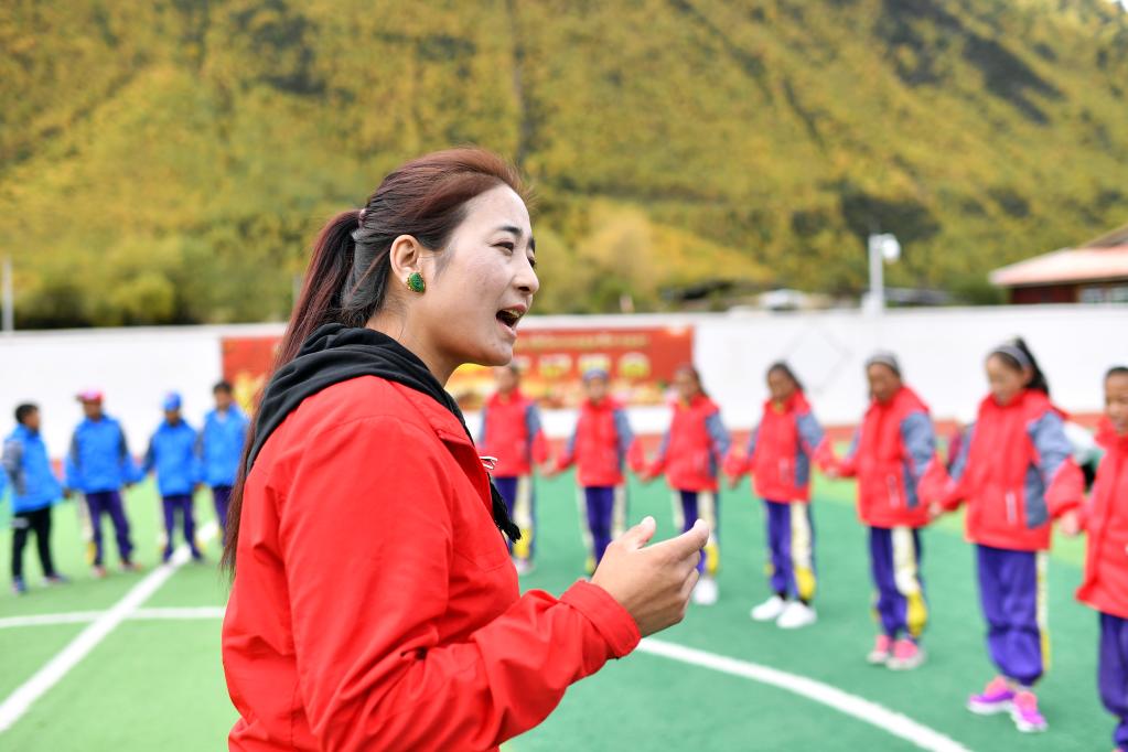 “手要有力量,转身要利索,脚抬高,幅度要大。”西藏波密县多吉乡中心小学的操场上,49岁的索朗扎西手持铙钹,脚步稳健,一边领唱,一边示范。身后跟着10名小学生,在认真模仿。