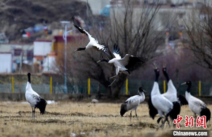 黑颈鹤是全球十五种鹤类中唯一在高原地区繁殖和越冬的鹤类,被誉为“高原神鸟”,属中国国家一级保护动物。每年10月中下旬左右,黑颈鹤陆续飞抵雅鲁藏布江中游河谷等地越冬。图为3月8日,西藏拉萨林周县黑颈鹤保护区,黑颈鹤在田间觅食、嬉戏。中新社记者 李林 摄