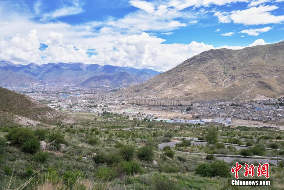 7月16日,从西藏拉萨娘热沟俯瞰,南北山的绿色植被环抱拉萨城区。据了解,拉萨南北山绿化工程于2021年启动,东起墨竹工卡县尼玛江热乡,西至曲水县茶巴拉乡,东西绵延近200公里,计划完成国土绿化面积206.72万亩,助力拉萨成为生态宜居的高原首府城市。中新社记者 张祥毅 摄