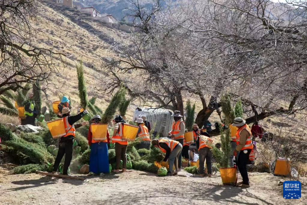 绿化养护工人泽仁巴西和同事们一起植树。(受访者供图)