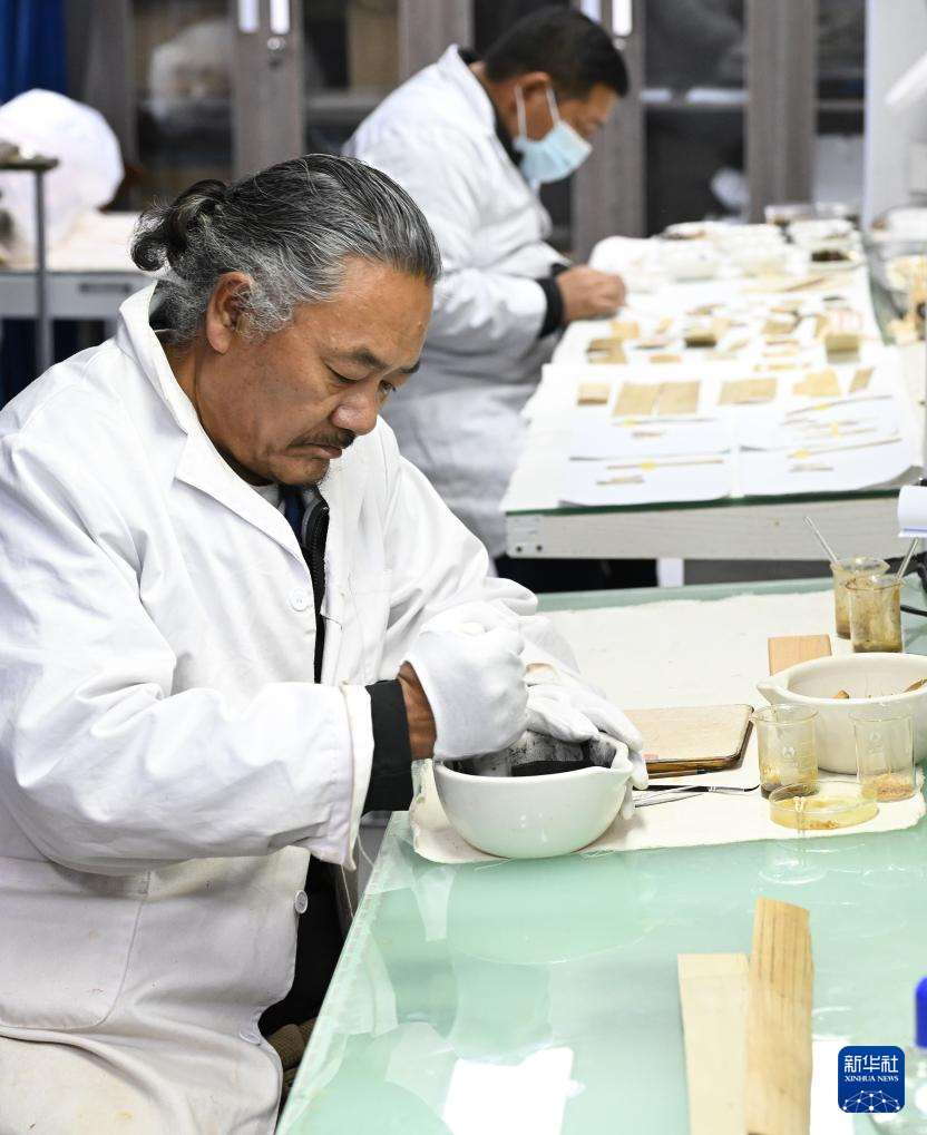 布达拉宫贝叶经实验性修复小组实验室工作人员对用于贝叶修复的颜料进行研磨处理(5月25日摄)。新华社记者 旦增尼玛曲珠 摄