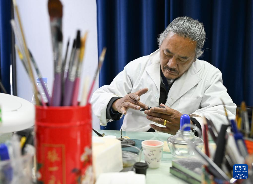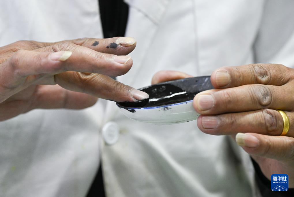 布达拉宫贝叶经实验性修复小组实验室工作人员对用于贝叶修复的颜料进行研磨处理(5月25日摄)。新华社记者 李贺 摄
