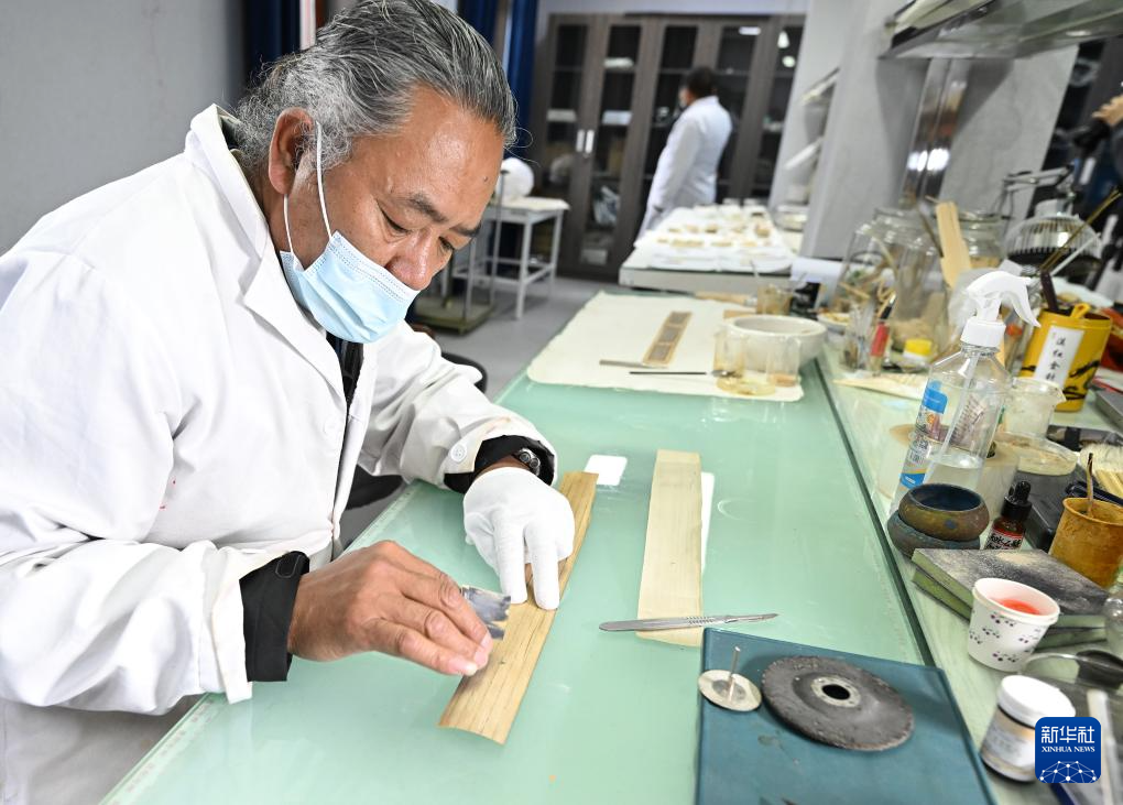 布达拉宫贝叶经实验性修复小组实验室工作人员对贝叶进行处理(5月25日摄)。新华社记者 李贺 摄