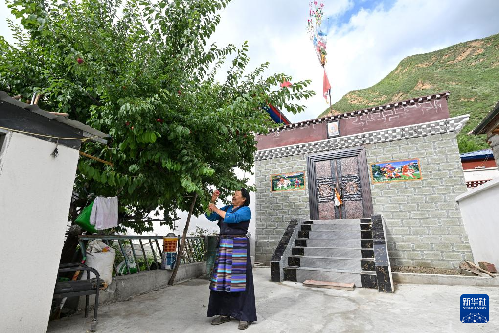 7月21日,63岁的拉丁雪村村民索朗康珠在改造提升后的自家小院内摘李子。新华社记者 李鑫 摄