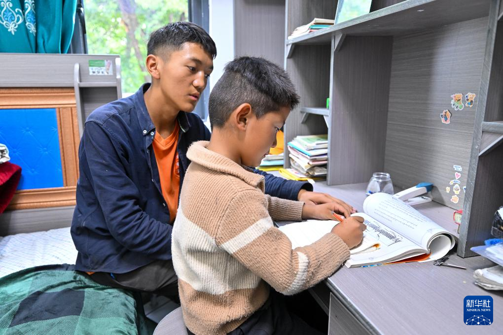 7月21日,17岁的米玛次仁(左)在新房卧室内辅导7岁的弟弟坚阿达瓦写作业。新华社记者 李鑫 摄