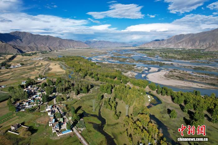 9月20日,拉萨河畔神秘树林风光,据悉该树林以前为荒滩。(无人机画面)中新社记者 江飞波 摄