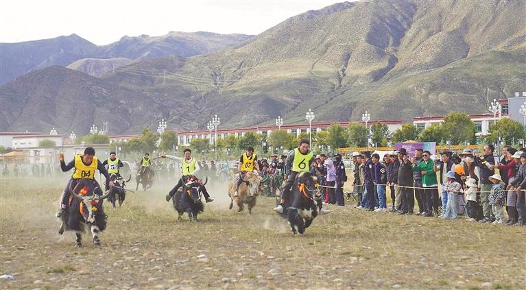 10月1日,拉萨市墨竹工卡县赛牛场举办独具特色的牦牛竞速赛,为游客和群众呈现了一场力量与速度的较量。图为激烈的比赛现场。记者 格桑伦珠 摄